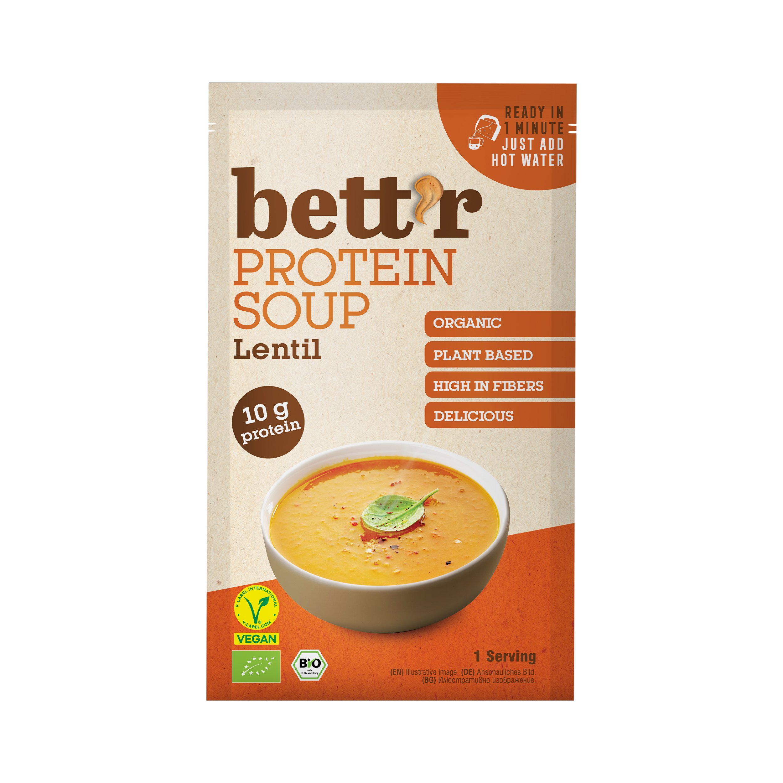 Supa proteica instant cu linte Bettr este bio, vegana, bogata in fibre si delicioasa – gata intr-un minut, doar adaugati apa!