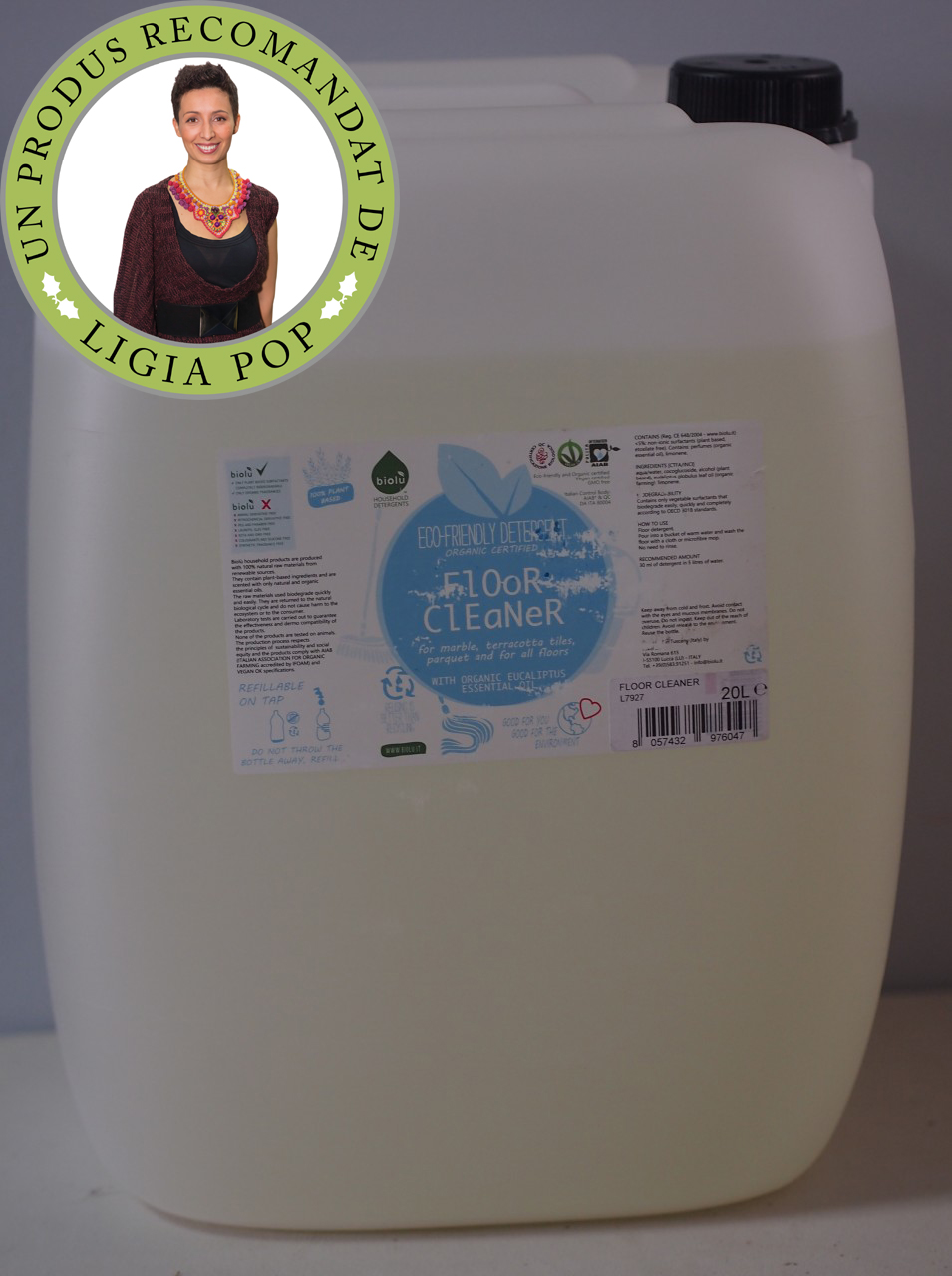 Un detergent delicat, non-agresiv, cu ulei esential de eucalipt din agricultura ecologica. Lasa un miros placut, si este potrivit pentru toate tipurile de pardoseala: ceramica, teracota, parchet, parchet laminat, linoleu, marmura, granit.