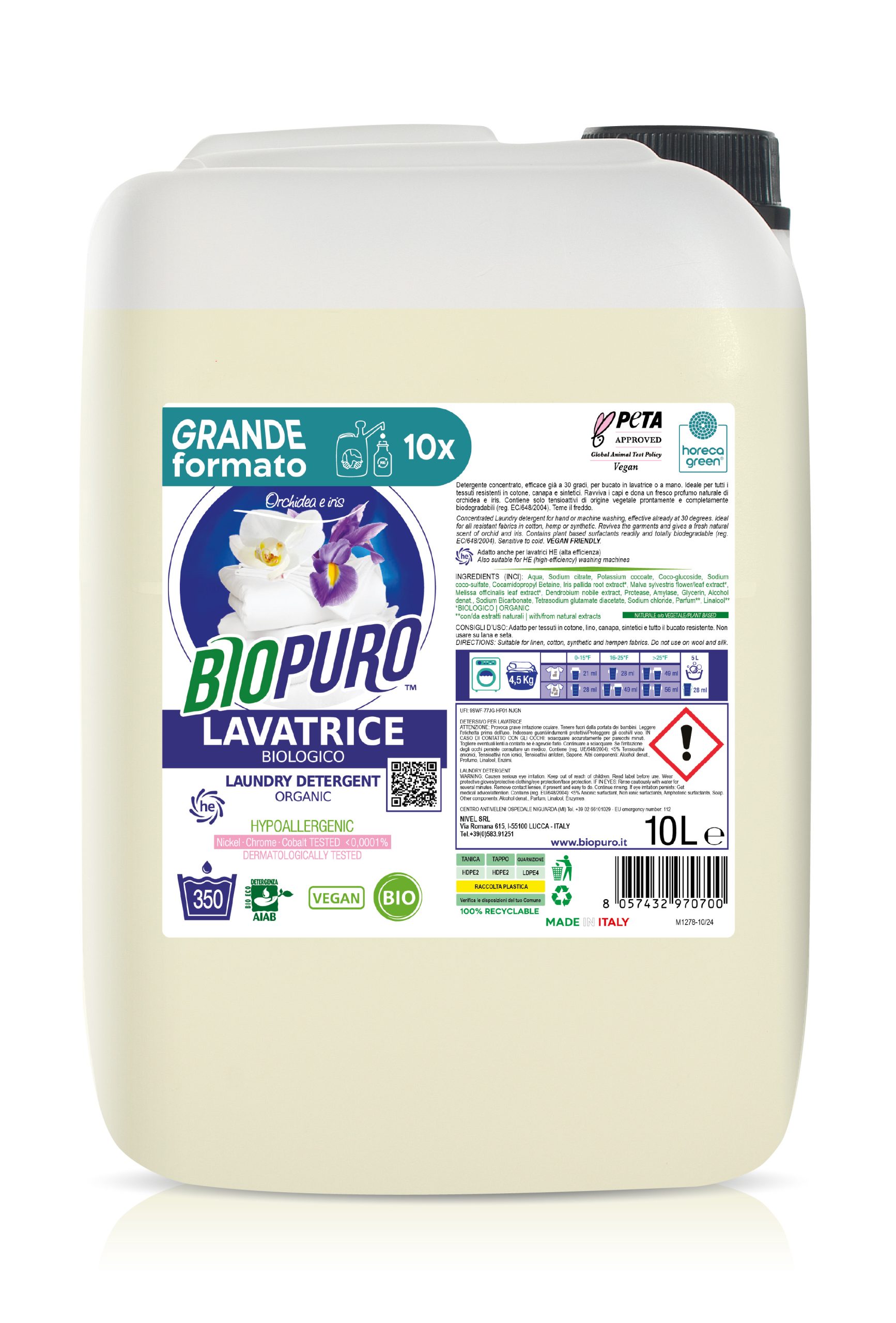 Detergentul Biopuro este ideal atat pentru rufele albe, cat si pentru cele colorate. Curata in profunzime, indeparteaza petele si revitalizeaza rufele albe si colorate chiar si la 30°. Formula sa cu extracte de iris si orhidee din agricultura ecologica ofera prospetime de lunga durata. Poate fi folosit in masina de spalat sau pentru spalare manuala pentru toate tesaturile rezistente din bumbac, canepa sau sintetice. Nu utilizati pe lana si matase.