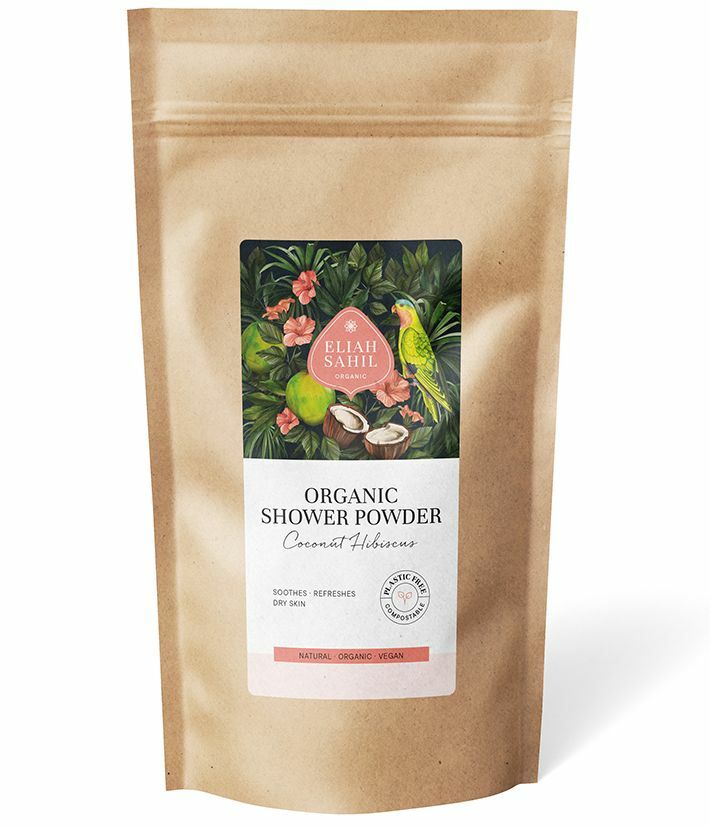 Aceasta pudra de dus certificata organic curata pielea in mod natural, hidrateaza si reimprospateaza. Extractul din cojile de nuci de sapun, saponinele si argila curata usor pielea fara a utiliza agenti tensioactivi iritanti, in timp ce extractele de aloe vera si plante ayurvedice revitalizeaza pielea. Aceasta pudra de dus usor spumanta, cu parfumul sau dulce si proaspat de hibiscus si de nuca de cocos, asigura o senzatie catifelata de moale pe piele care persista dupa dus.
